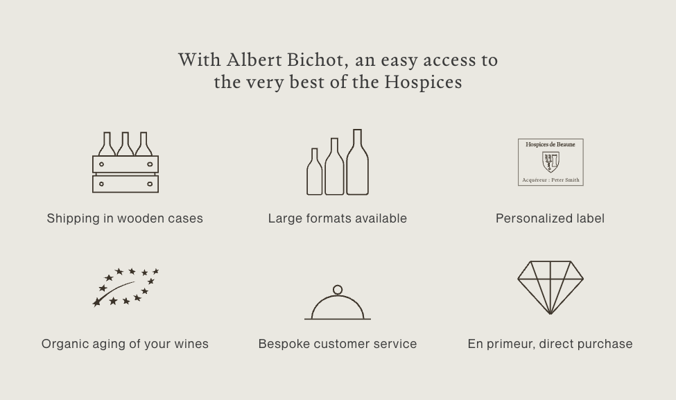 Buy our Albert Bichot selection of 2 white wines and 3 red wines from the 2025 vintage at the Hospices de Beaune auction on November 16. From one bottle only. Custom label optional.